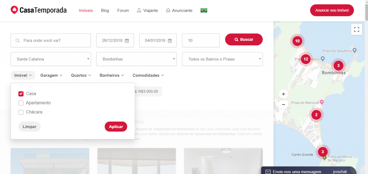 Exemplo: Se você gosta apenas de casa e não de apartamento, você pode filtrar os imóveis da localidade que tenham apenas casas, para melhorar ainda mais a busca, você pode selecionar o filtro de comodidades e clicar em itens como piscina privativa, para concluir clique em buscar e o CasaTemporada irá mostrar todos os imóveis da localidade que serão neste caso, Casas com Piscinas. Se desejar ter outro item na Casa, por exemplo, garagem para 3 carros, selecione o item garagem e digite a quantidade de vagas que precisa. Para uma busca ainda mais seleta você poderá optar por informar a quantidade de quartos, como um imóvel com 3 quartos, selecione a quantidade de 3 quartos, sabemos que seu empo é preciso e valorizamos ele, assim o site CASATEMPORADA irá te apresentar os imóveis que realmente irão atender sua demanda.